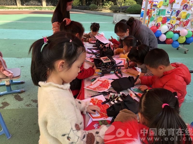 第二关,“金牛送祝福”。小朋友按照老师要求,在自己制作好的贺卡上工工整整地写上一句祝福语,大声地朗读出来。“祝你学习进步!”“祝你牛年天天开心!”“祝您在2021年工作顺利”……大大的“新概念集邮”明信片上贴满了浓浓的新春祝福。