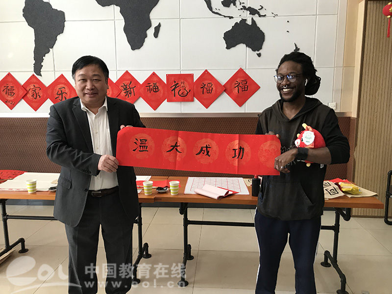 赵敏观看了留学生各项比赛并与他们亲切交流,了解学生们留校的学习生活情况,并向留学生送上了新春大礼包,留学生代表还向校长赠送了自己写的新春“福”,并用中文新春祝福语表达感谢之情。