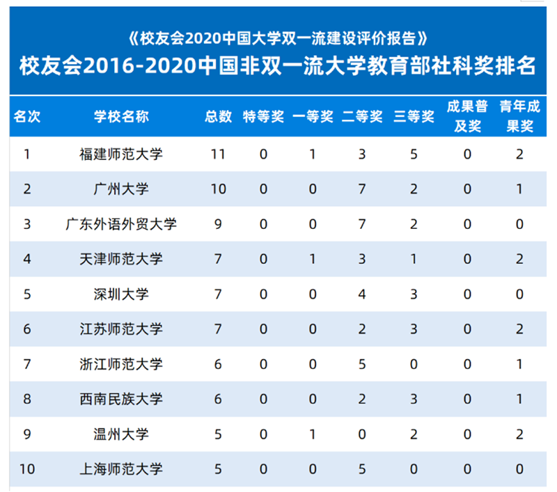 另外,在校友会2016-2020中国大学金博宝最新官方网站查询网址 社科奖排名中,温州大学位居全国第58位,在校友会2016-2020中国非双一流大学金博宝最新官方网站查询网址 社科奖排名中,温州大学排名第9位。