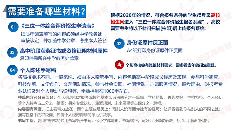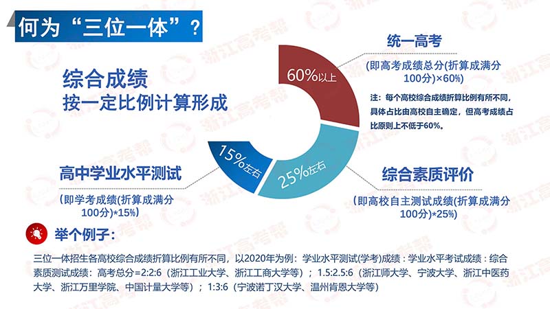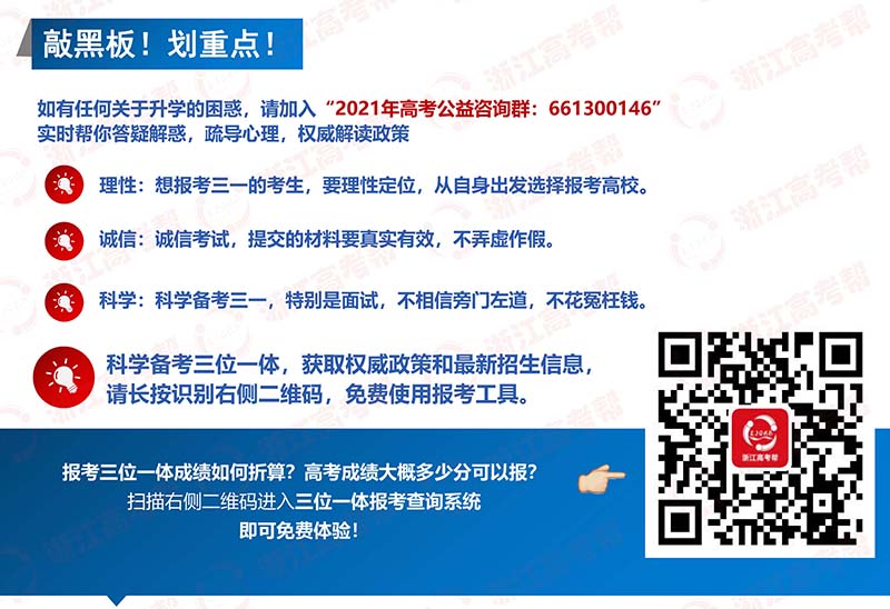 当下,2021高考生和家长最需要做的就是明晰政策、读透政策、把握政策。比如什么是三位一体招生?哪些考生适合报考?报考时需要注意什么?综合成绩怎么折算?面试需要注意哪些细节?等等。针对这些要点,今天浙江高考帮带来了一篇干货——浙江“三位一体”综合评价招生图解,保证让你,一图就能看懂三位一体招生政策。