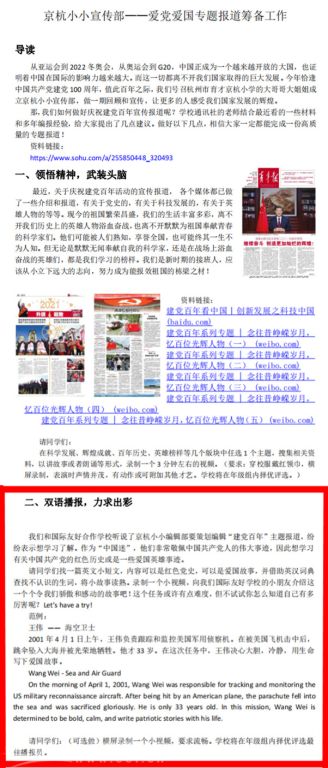 同时,五年级的同学还参与了“京杭爱党爱国专题报道筹备工作”之双语播报活动。