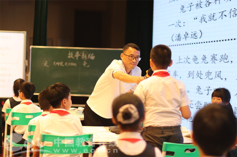 蒋军晶老师以诙谐风趣的语言打开了想象世界的大门,他的课堂妙趣横生又引人深思。他和孩子们一起体会经典故事中的经典之义,言浅意深。接着通过学生课前习作,引导学生欣赏并思考如何通过情节的“创新”,让想象真正插上翅膀。蒋老师还分享了古今中外不同作家写的“龟兔赛跑”故事,让学生深刻领略了文章的精妙和作家的巧思。蒋老师和学生真实而充满智慧的对话,也让听课的每一位老师都沉浸其中,回味无穷,深深地感受到蒋老师课堂独有的魅力与深度。