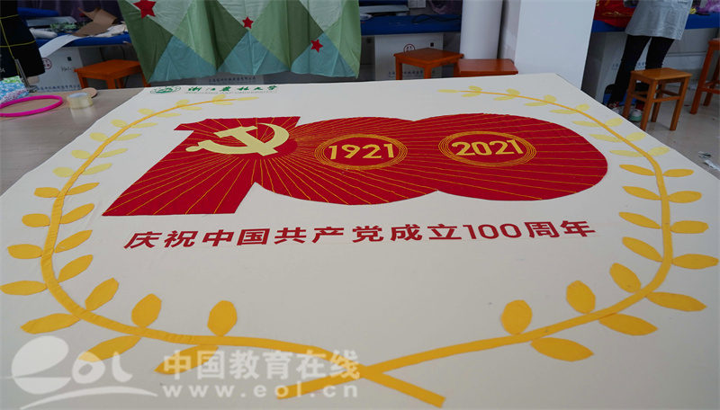 金宝搏188入口 浙江站讯 (实习记者 鲁少辛 通讯员 陈胜伟)2021年6月30日晚,浙江农林大学艺术设计学院服装设计191班的卢延、王倩雯、王心书、金璐怡等同学,在老师指导下经过100多小时的绣制,终于完成了纯手工绣制的建党百年庆祝标识,这也是她们献给中国共产党成立100周年的礼物。