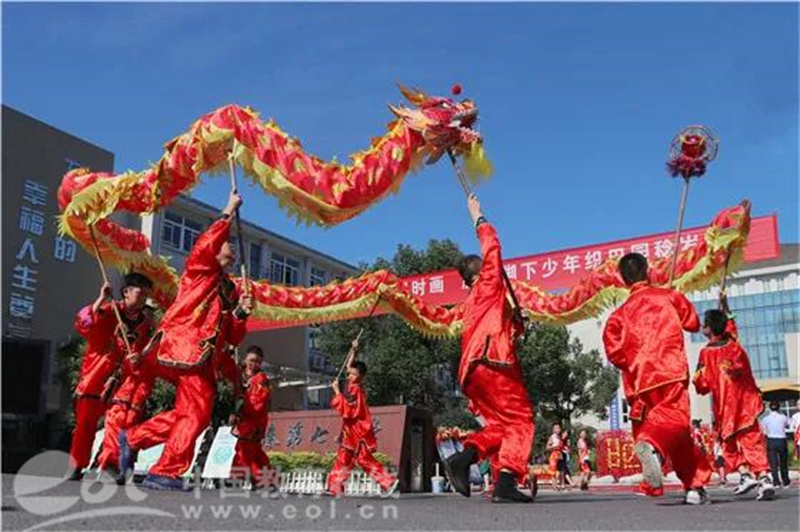 木架上“晒”满玉米、南瓜、大蒜、辣椒,粮仓、大风车、独轮车、挑担、传承者农耕文化。一年级新生名单也“晒”在了竹匾上。