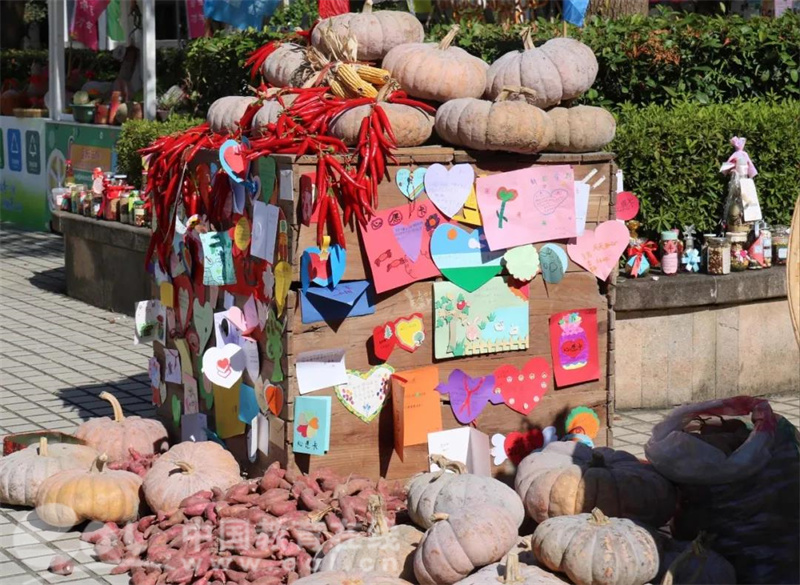 小广场内到处晒着各种各样秋天收获的农作物:每个孩子收集制作的种子收集罐、成品果实全部晒在五颜六色的展车上,瓶罐上写上品种、班级姓名、采收时间和地点,暑期劳动小达人、社会实践小达人、阅读小达人、才艺晋级小达人KT板晒在广场两侧,供大家参观交流学习。