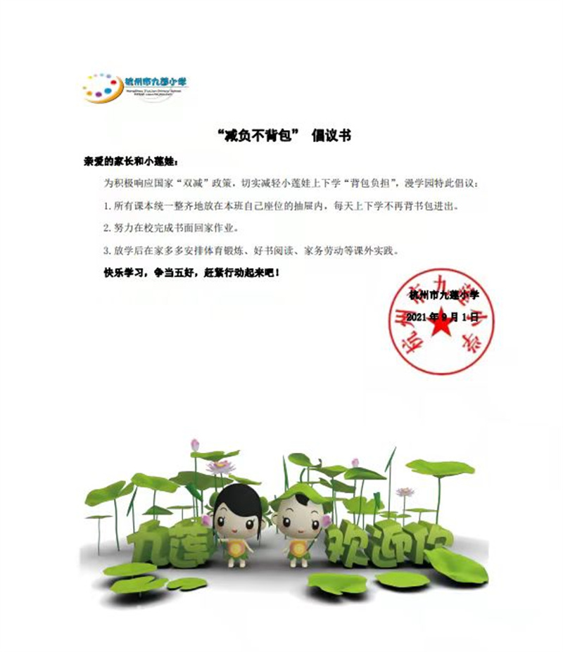 昨天一早,杭州市九莲小学的孩子们在家长的带领下回归校园。刚回到学校,孩子们就收到了来自“漫学园”蒋晓校长的“见面礼”——“减负不背包”倡议。