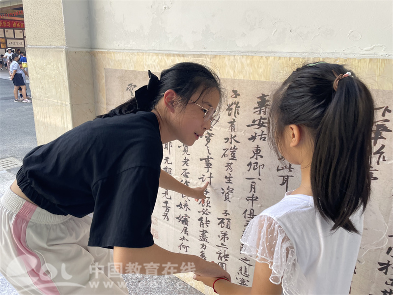 环境识字中,一年级的小朋友们好奇地问着,认真地听着,大声地跟读着……六年级的大哥哥大姐姐们耐心地回答着,细致地讲解着,清晰地念着……主席台前、树荫下、长椅上都有他们认真专注的身影。他们一大一小或牵着手站立,或蹲着依偎在一起,校园里弥漫着一股浓浓的温情。