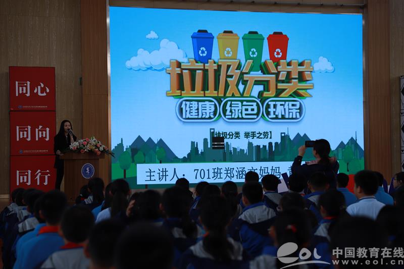 11月9日下午,校“家长智库”成员,701班郑涵文妈妈黄飞女士给七年级全体孩子做了主题为“我们都是环保小卫士之垃圾分类”的讲座。黄女士以图片、视频生动地给孩子们展示了现如今中国垃圾的现状,同学们都被深深震撼到了。原来大自然已经对人类发出了警示,我们已经处在了“垃圾围城”之中