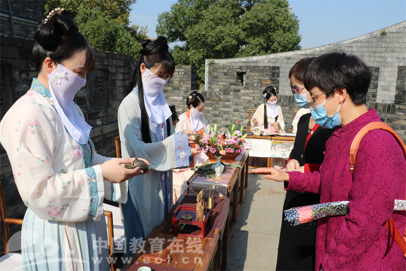 活动现场,天艺幼儿园的教师们身着宋服,以宋韵四雅为载体,情境式地为到场的来宾展现了宋人生活的优雅,以宋韵小游戏投壶、沙包等,展现宋人游艺的趣味。