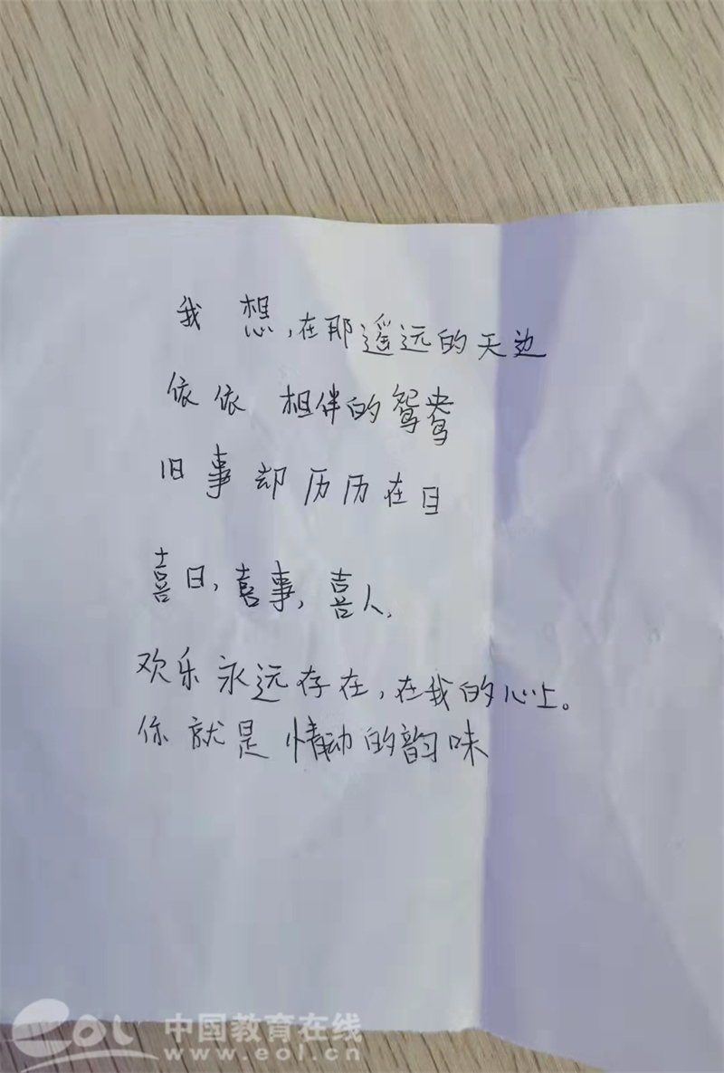 看了这首“藏头诗”,教语文的沈老师第一感受就是这个学生“挺有才”。她笑着说:“这个男孩子平时语文成绩中等水平。诗我觉得写得不错,表达了自己最真实的情感。”