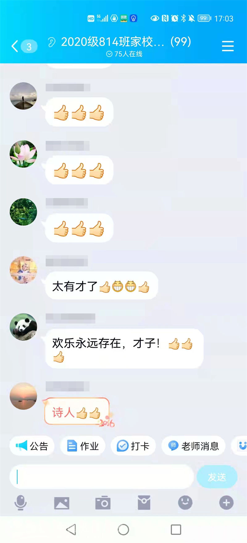当天,沈老师处理完这件事后,将男生写的“藏头诗”发到了814班家校联系群。一石激起千层浪,群里的家长纷纷出来冒泡,为这首诗点赞,“太有才了”一时间刷屏了。