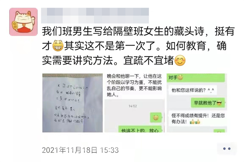 在沈老师看来,有智慧的班主任应“手持戒尺,眼中有光”,也就是要恩威并施,以情动人。这次处理“藏头诗”表白事件,就充分了体现了这一点。就像她在朋友圈说的那样:我们班男生写给隔壁班女生写藏头诗,挺有才,其实这不是第一次了。如何教育,确实需要讲究方法,宜疏不宜堵。