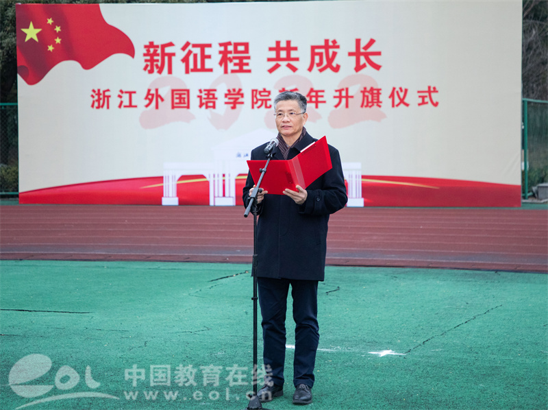 宣勇代表学校党委、行政向师生们致以节日的问候和新年的祝福。他表示,在新年的第一天举行升旗仪式是对祖国的衷心献礼,浙外人用满腔的爱国热情和对未来的美好期盼唱响了爱国主义教育新年第一课。宣勇指出,2021年,浙外人亲历见证了中国共产党成立100周年,举办了庆祝建党百年系列活动,深入开展了党史学习教育,持续掀起学习贯彻党的十九届六中全会高潮,接受了爱党爱国的集中教育,并转化成了事业拼搏的意志豪情,改革路上持续发力,推进治理体系和治理能力现代化渐入佳境;内涵式发展凝心聚力,学校“十四五”规划高质量开局;党的建设聚焦用力,忠诚拥护“两个确立”、坚决做到“两个维护”深入扎根;赢取了学校建设发展的累累硕果。