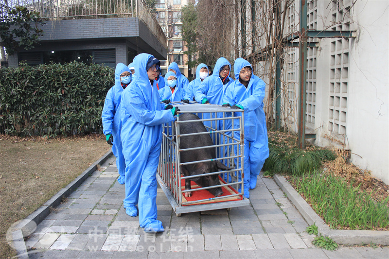 在称猪活动开始前,大伙儿本以为猪赶进笼会颇费一番力气。可没想到,大家异常顺利地便将其中一头黑猪“呼呼”赶进了笼子。