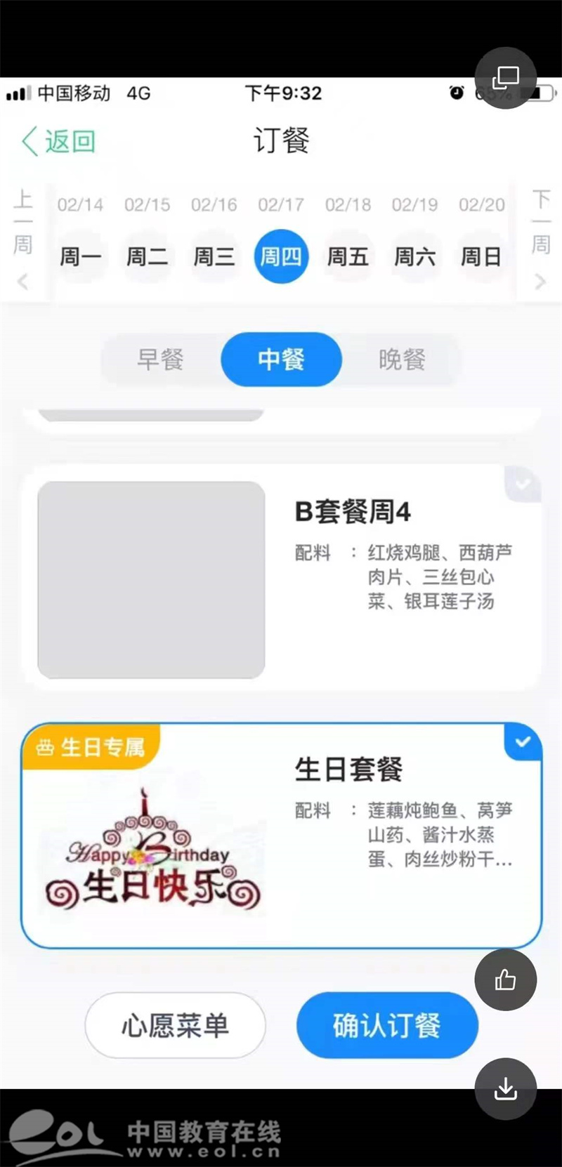 此外,在生日当天,“小寿星”还有特殊照顾——在生日快速通道排队,通过“刷脸”可以很快拿到自己预定的生日套餐。排队取餐窗口上方的电子屏上,还会有滚动字幕,出现自己班级的老师和同学的生日祝福。