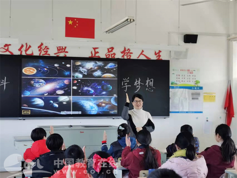 在观看直播课前,各班级还开展了各式各样的“科学”主题班会课,同学们在老师的引导下,畅谈自己的科学梦想。有的说,希望自己可以飞上太空;有的说,想发明更加功能齐全的手机;有的说,成为袁隆平爷爷那样的农业学家是自己的梦想……同学们从自己的生活起航,天马行空般地翱翔在想象空间里。