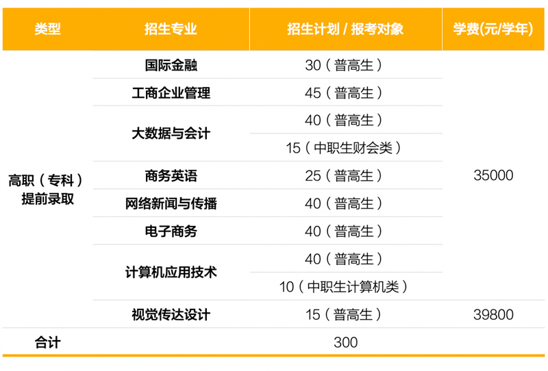 学校2022年高职提前招生计划300名(其中面向普高招生考生275名,面向单独考试招生考生25名),具体招生专业及计划如下: