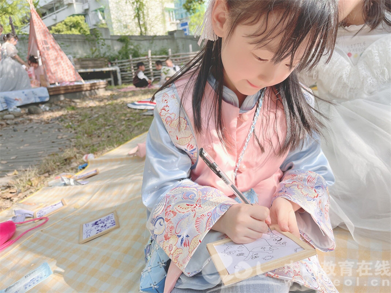 游园会开始后,孩子们便开始拿着游园卡到各个点位打卡。有的孩子用自己的巧手做了精致的春日相框;有的孩子用小锤子在白色T恤上敲敲打打,不一会儿一朵朵小花就“绽放”了;有的孩子穿着漂亮的时装在七彩泡泡的衬托下,合着音乐的节奏开启了属于自己的秀场;有的孩子则拿着手绘地图在神秘的生态园里寻找“江南忆”的“踪影”……每个孩子都用自己喜爱的方式,创造着属于春天的快乐回忆。