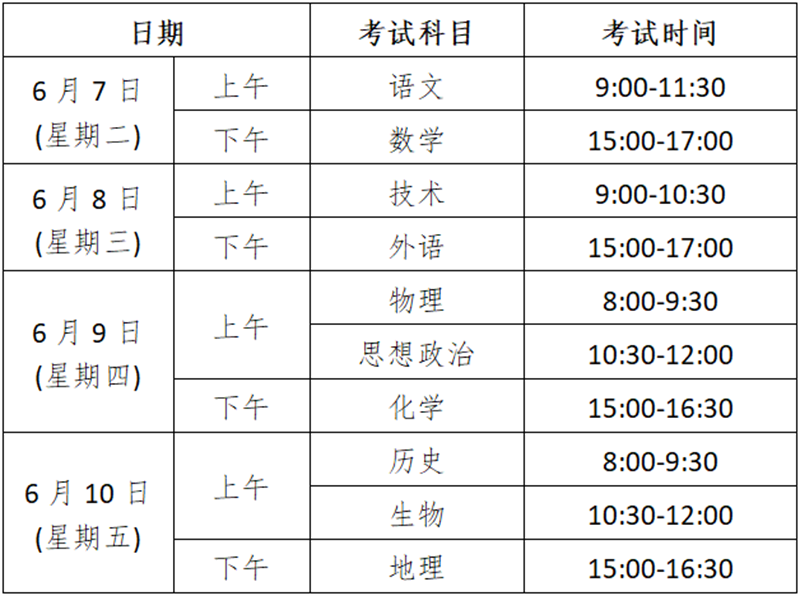 2022年我省统一高考招生报考科类分为普通类、艺术类、体育类。普通类考试科目为语文、数学、外语3门必考科目和3门选考科目。考生根据本人兴趣特长和拟报考学校及专业的要求,从思想政治、历史、地理、物理、化学、生物、技术(含通用技术和信息技术)等7门科目中,自主选择3门作为高考选考科目。艺术类、体育类考生除文化科目外,还须分别参加艺术类专业考试和体育术科考试。各科目考试时间如下表: