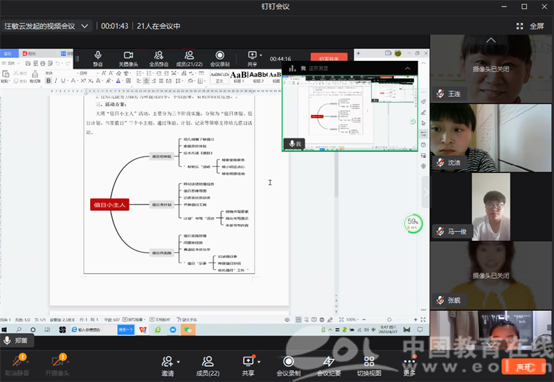 为加强教师对幼儿过渡期特点的理解,自觉研究过渡期每个幼儿不同的发展特点及需要,有计划、有针对性地开展衔接工作,全体教师通过钉钉视频会议的方式进行研讨。小班、中班、大班的教师们分别从不同年龄阶段下“幼小衔接的计划与实施”出发进行讨论。