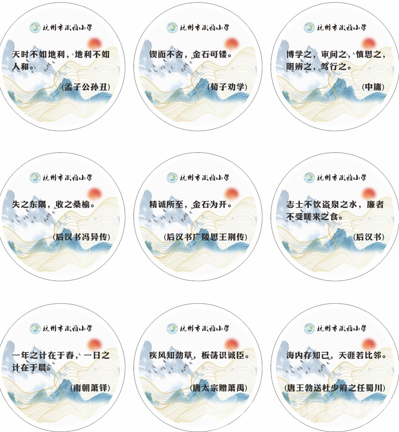 每隔一米,地上都贴了一个点位图,上面印着各种各样的古诗词,比如“千里之行,始于足下——《老子》”。当学生排队时,便可以看着地上的诗词,自行读背。随着队伍往前移动,学生也能学到不同的诗词。