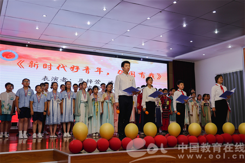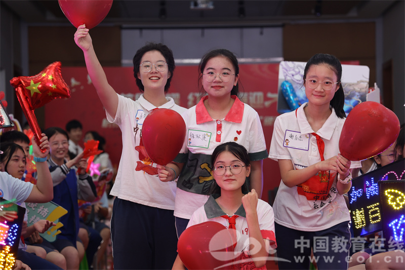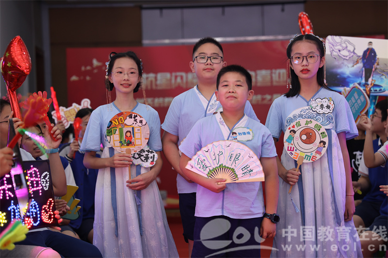 六至八年级的同学则身着自己绘制的特色党史T恤走上红毯。30余件党史题材绘图的T恤,主题鲜明,内涵丰富,展示了同学们的创新创造能力。队员们用自己的方式宣传党史,向二十大献上了最诚挚的祝福。