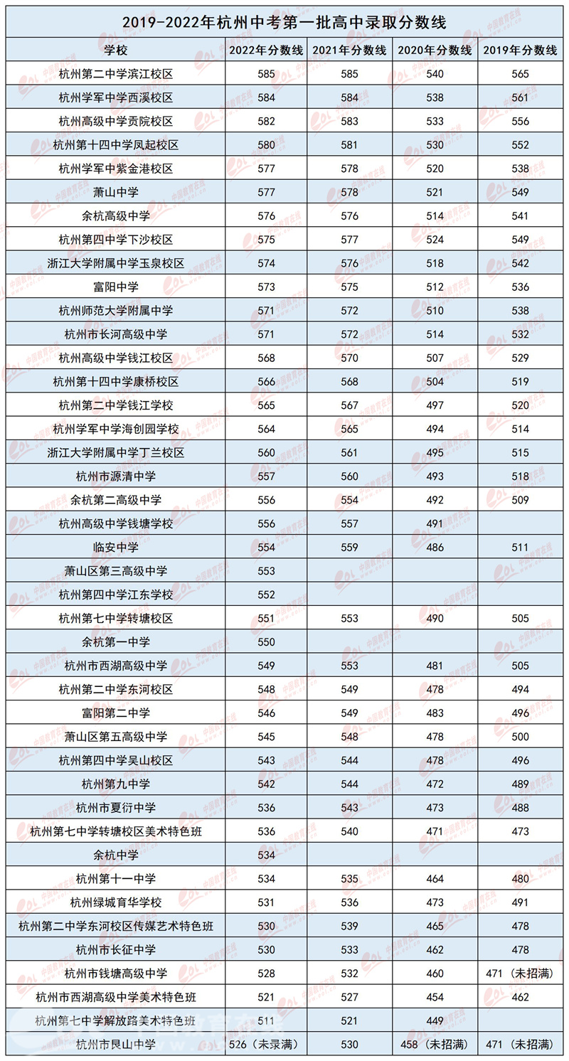 2022年杭州市区第一批最低录取控制分数线为526分。第二批招生普通高中、职业高中(含“中高职一体化”五年制班)最低录取控制分数线为270分;普通中专最低录取控制分数线为240分;市区技工学校最低录取分数线由各校自定。
