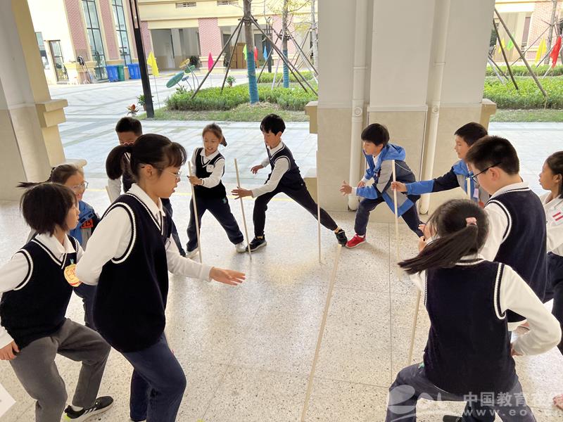 小队活动十分考验少先队员们的基本素养以及团队协作能力。合作章的考核以整个越胜校区为范围,选取医务室、广播室等8个打卡点位,要求队员在完成合作游戏“不倒森林”后,再根据定向地图,合理规划路线,在最短时间内完成定向打卡。