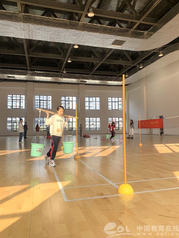 体能章的考核中,少先队员们肩挑扁担越过障碍。本次考核结合劳动内容,既考察了队员们的基本身体素质和运动能力,也让他们体会了劳动人民的不易。