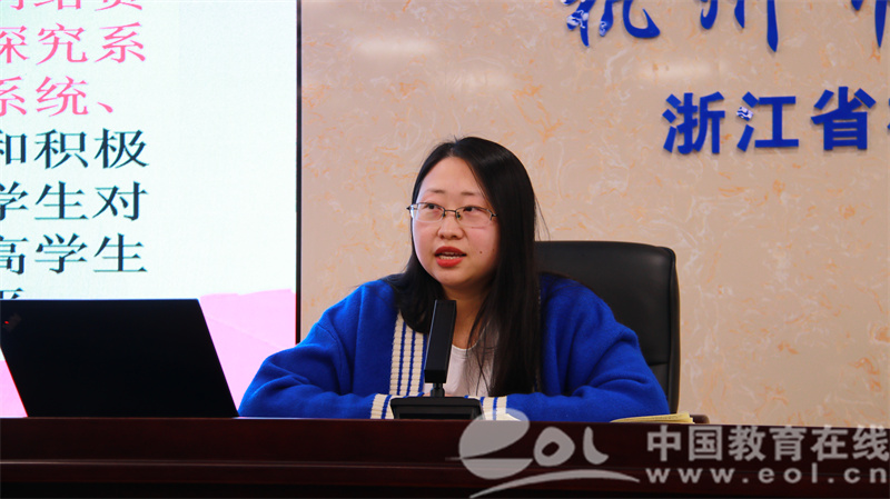 2022年杭州市教育科研成果(教师小课题)二等奖获得者娄珊老师,向大家分享了她的科研成果《三维十环:基于现代信息技术的高中政治课教学新模式探究》。娄老师介绍了自己课题的研究思路、研究背景、研究设计、研究框架、操作策略、具体实践等内容。她认为,教师要以问题意识引领自己的教育科研工作,时刻将教学实践与教育科研结合起来,以科研引领实践,以实践深化科研,在实践中不断提高自身的教育教学水平,促进教师自身的专业化发展。
