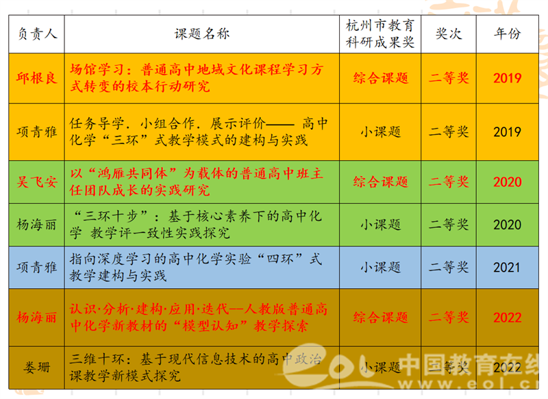 据何主任介绍,2019年至今,学校共有7项教育科研成果在杭州市评比中获奖。何主任表示,这些成果的取得,展示了钱高人与时俱进的办学理念;展示了钱高人卓有成效的科研历程;展示了钱高人勤奋务实的科研态度。在杭州市钱塘高级中学,每一位教师都努力“在研究状态下教学”、“在研究状态下育人”,由此而形成的浓郁的科研氛围和探究意识,已经成为钱高独特的学校文化,为教育界同行所赞誉。一批科研骨干教师如杨海丽、项青雅、娄珊、王麒、金君萍等也逐渐成长起来。他们也因教育科学研究方面的不懈追求而顺利评上高级职称、教坛新秀、区级名师等称号,实现价值、逐梦前行。