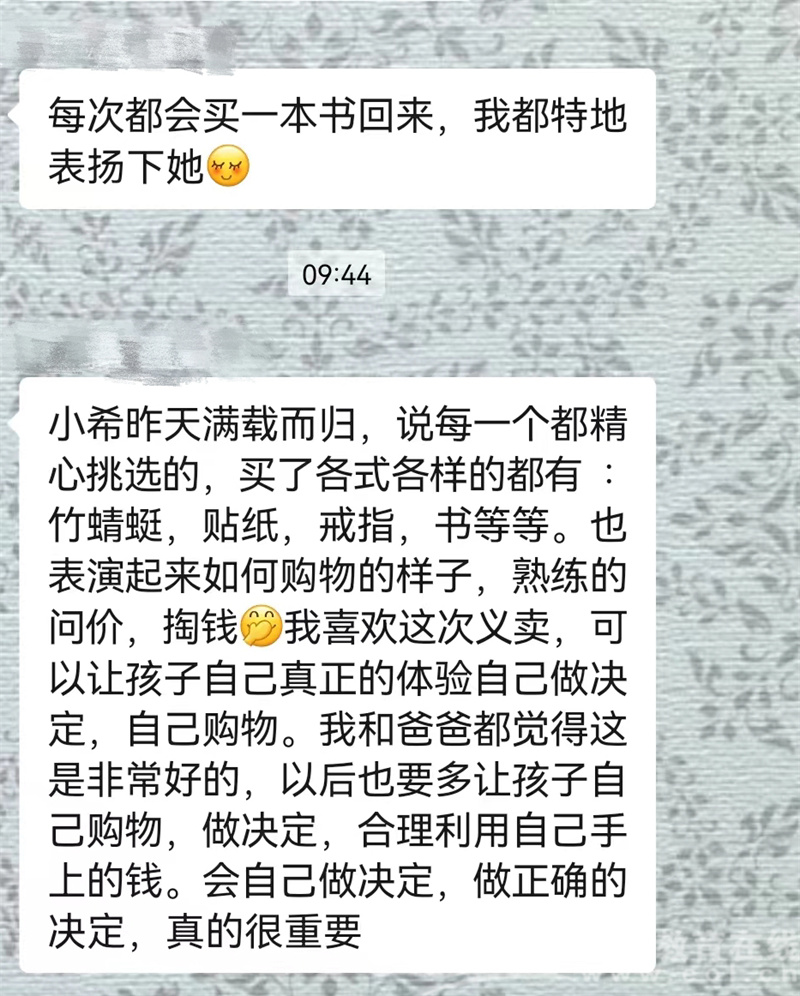 孩子们手上拎着大包小包,享受着第一次“独立购物”的欢喜雀跃,体会着“照顾幼小”的自豪感,感悟着“奉献爱心”的温暖快乐。闲置的旧物在这里凝聚成温柔的力量,孩子们在独立购买销售、货比三家的过程中,俨然是一个个小大人的模样。