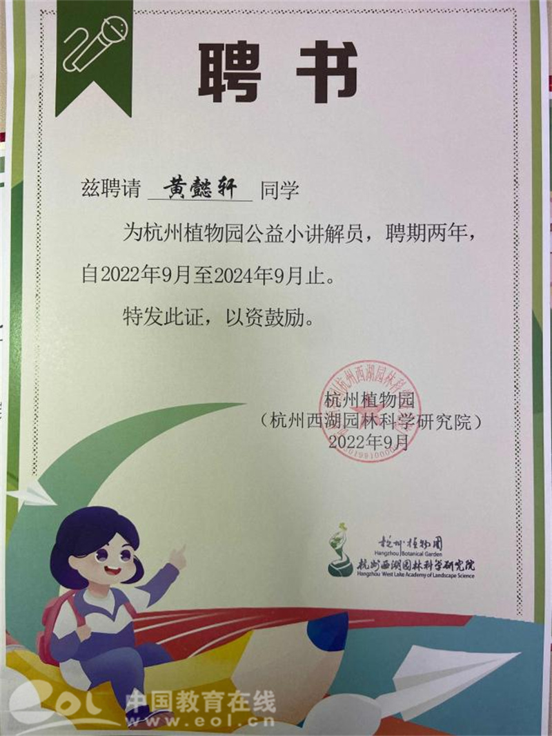 金宝搏188入口 浙江站讯 (记者 鲁少辛 通讯员 李水晶)11月13日下午,以“绿色亚运·你我同行”为主题的杭州市第二届生态文明小主播大赛颁奖典礼在杭州植物园圆满举行。这次意义非凡的大赛,让更多孩子放飞梦想。杭州市文海第二实验学校“晶多”小记者班的黄懿轩同学在大赛中荣获“博学小主播”称号,并被聘请为杭州市科学技术协会和杭州植物园“公益小讲解员”,将有机会参与相关的科普培训和讲解工作。