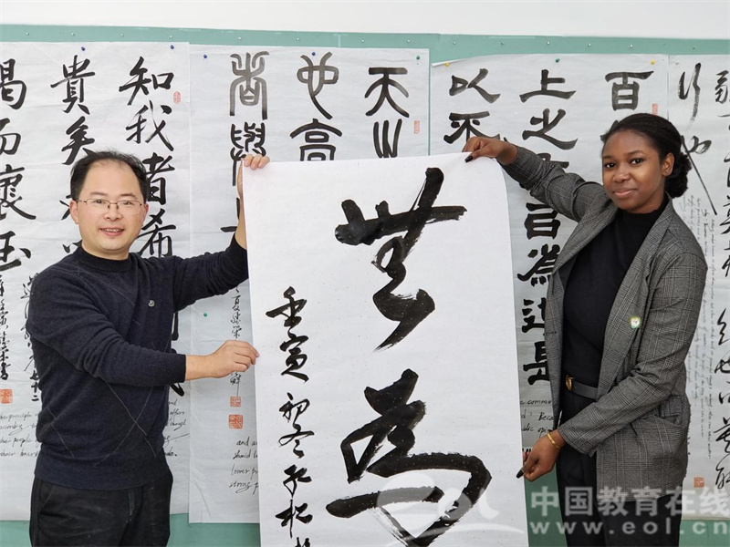 浙江省书法教育研究会副理事长蔡东福、浙江记协书画摄友会副会长陈红松等两位书法家和学正中学教师发展中心主任王胜荣,分别在主席台上当场书写《中华文化》《中国自信》《国际交流》等作品,并由中外教师用英中两种语言,为全体师生解说。