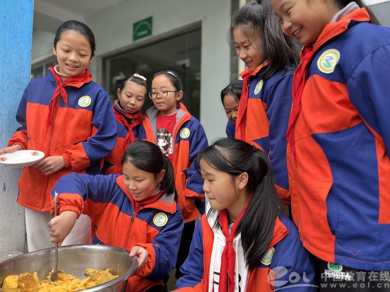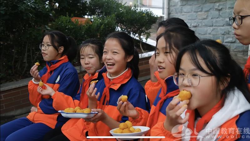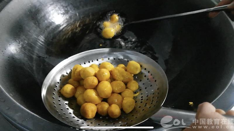 番薯太多没法储存,能拿来做些什么呢?同学们集思广益,决定开启“薯”于他们的美食之旅。清洗、削皮、切块、蒸煮、起锅、碾碎、加入白砂糖和糯米粉搅拌均匀,揉成小丸子,放入油锅炸,香喷喷的红薯丸子出锅了。同学们终于吃到自己亲手做的红薯丸子。