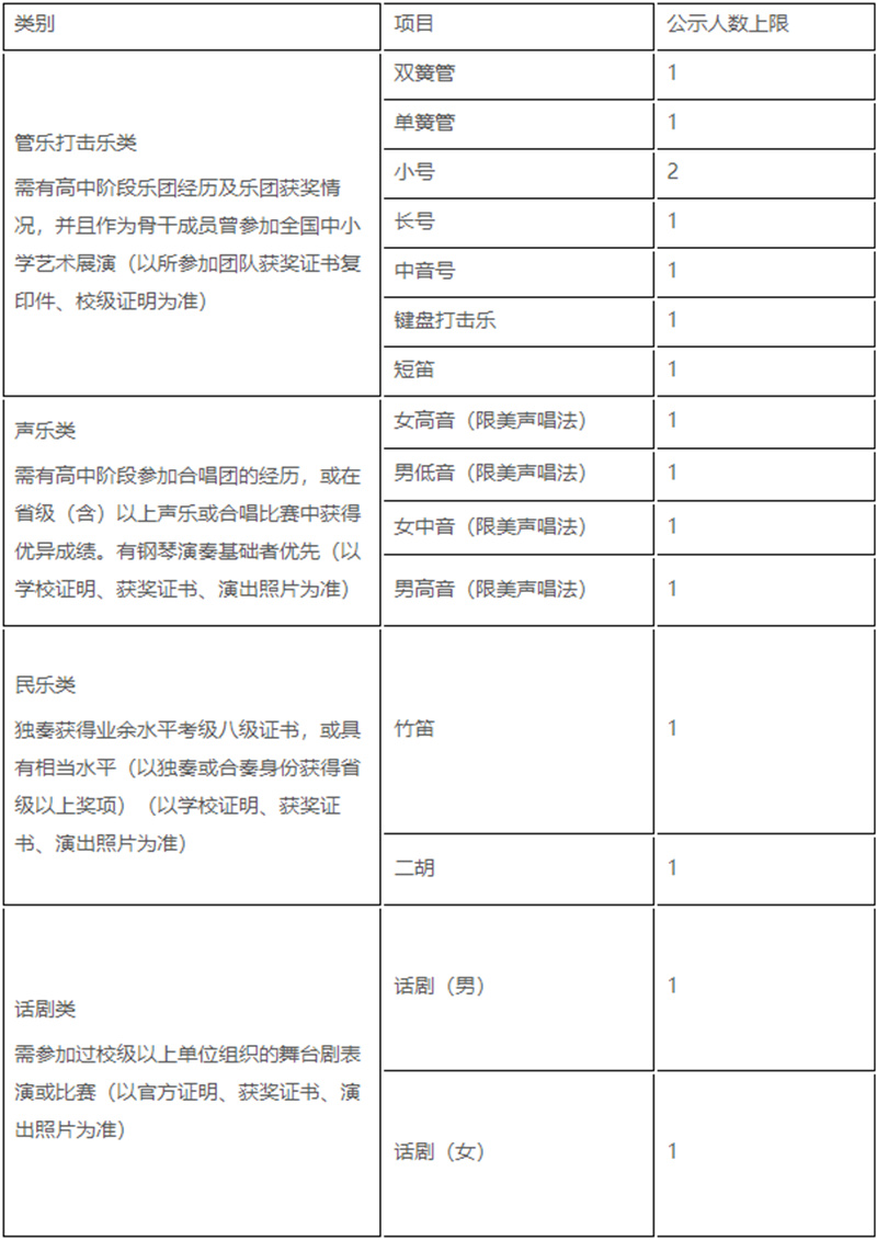 2023年我校将根据艺术团发展的需要,按管乐打击乐类、声乐类、民乐类、话剧类四个大类进行招生。招生计划数为7人,拟公示合格考生人数不超过14人。各大类及单项公示人数上限如下: