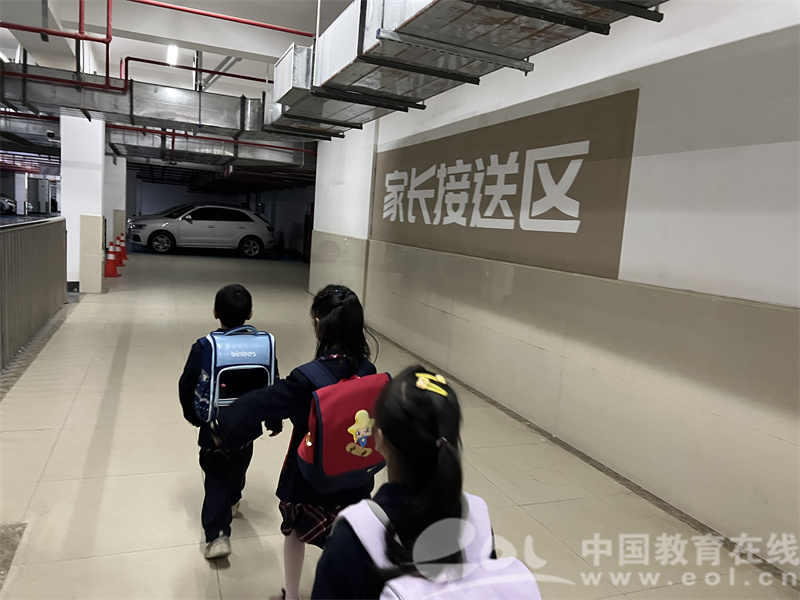 去年暑假,钱塘区教育局联合区治堵办经过调研,巧妙地利用云帆小学校园地下车库作为中转站,将开车接送孩子的家长与绿色出行的家长分隔开,并在地下车库设置专用人行道,保证家长及学生的通行安全。