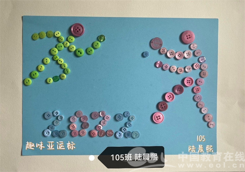 趣味亚运标志。孩子发挥奇思妙想,借助玉米粒、绿豆、锡纸、粘土、积木、吸管、果盘等五花八门的材料,生动形象地呈现了亚运标志。拼搭的标志栩栩如生,充满了童趣。
