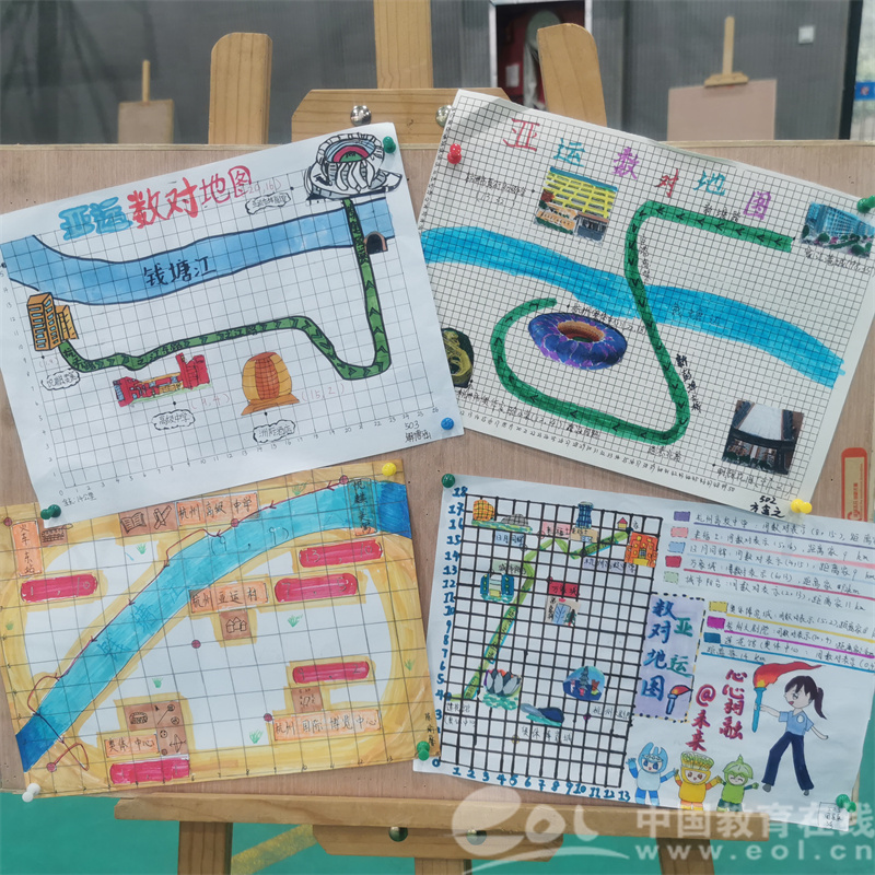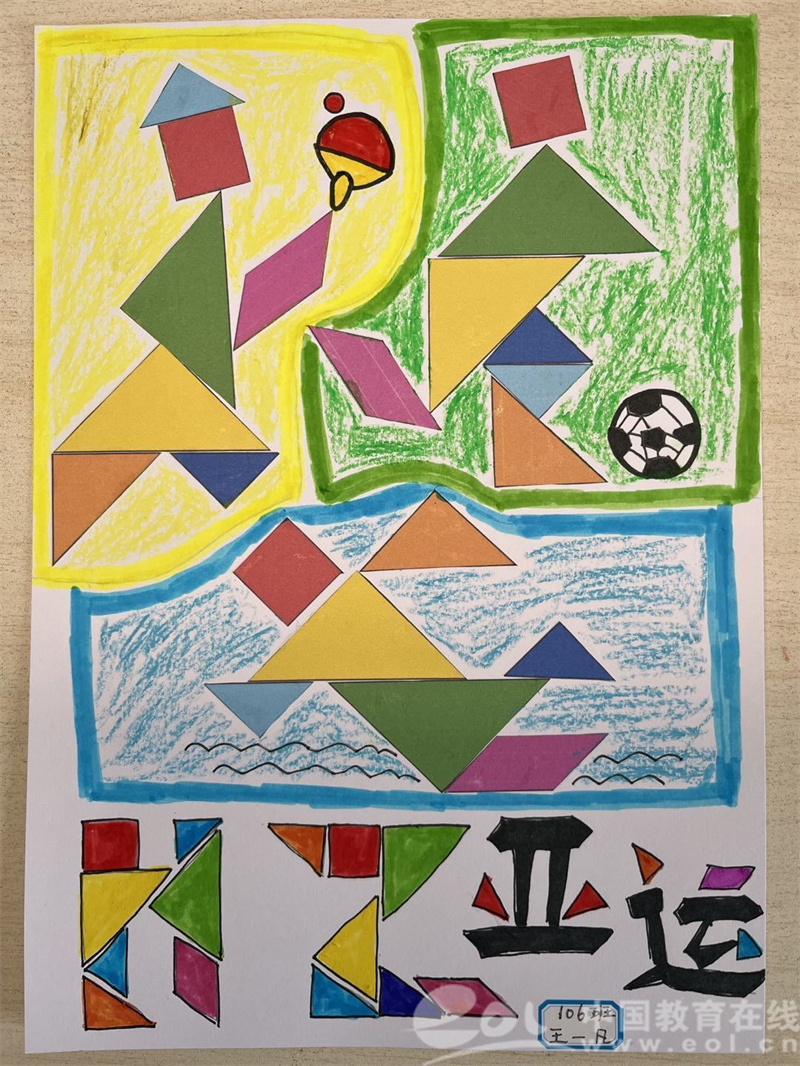 七巧迎亚运。数学也可以用来玩,潮娃们以喜爱的益智玩具七巧板作为创作元素,拼绘了一幅幅丰富多彩的和亚运有关的人和事物。三角形做手、正方形做头、平行四边形做腿......一个个运动健将赫然立于纸上。