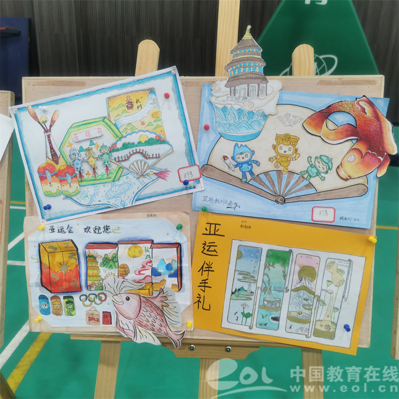 亚运伴手礼。同学们为各国来宾和运动员设计了一套具有杭州特色的”伴手礼“,体现出杭州独特的人文内涵。
