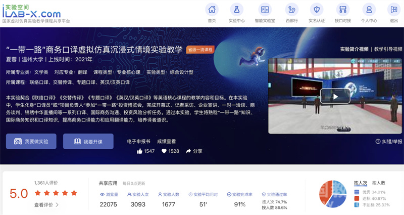 “一带一路”商务口译虚拟仿真实验教学项目于2019年获“十三五”浙江省一流课程立项建设,2020年获软件著作权,2021年被遴选在国家虚拟仿真实验教学共享平台(即“实验空间”)开放共享。目前该实验人次已达3093次,覆盖全国21个省、3个自治区、1个直辖市和92所高校。实验因其过程流畅丝滑、真实感强、体验感好、专业性强、知识面广等,广受欢迎和好评,多所省内外高校已将其列入教学大纲,并计划长期使用。