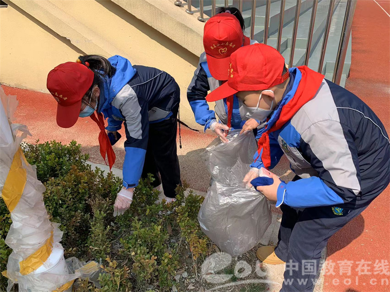 为减少垃圾污染,绿化美化环境,身穿红马甲、头戴小红帽的志愿者们,在校园内、外清理生活垃圾。志愿者们不怕脏累,秉承“奉献、友爱、互助、进步”的志愿服务精神,按照“全面清理、不留死角”的原则,拿着垃圾袋,沿途捡拾塑料袋、废纸片、易拉罐等垃圾,做好“随手捡”的榜样,用自己小小的力量美化环境。