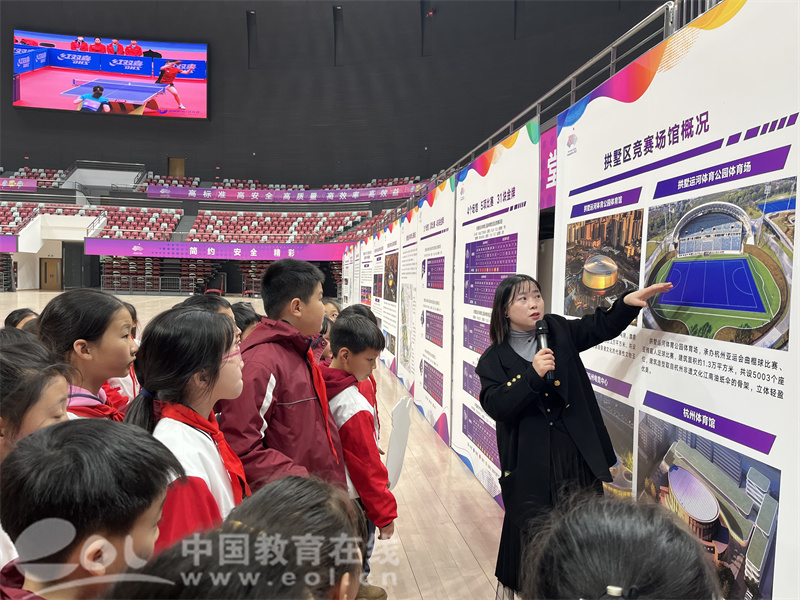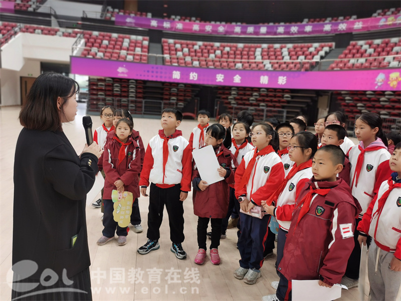 “哇,看外形一片一片好像鱼鳞哦!”“这里会召开亚运会?”“这里举办什么比赛?”“我知道我们国家国球是乒乓球。”队员们带着满满的好奇走进了国球中心场馆内来找寻答案。场馆孙老师告诉队员们:国球中心场馆将承办乒乓球和霹雳舞比赛。她还向大家介绍了场馆大屏、鹰眼系统、馆空调系统等等,高新技术的支持,将会让赛事进展更为顺利!张老师还告诉队员们,甚至连场馆内的座椅颜色也十分讲究,不同的颜色设计,不仅能避免审美疲劳,还能避免和白色乒乓球混在一起,影响运动员视线