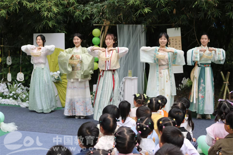 教师还表演了《长歌行》。阳光绿草、大地鲜花,轻轻作响的竹林都是大自然赐予我们的宝贵财富。手拿传统竹编篮,以舞蹈探寻春的美丽。