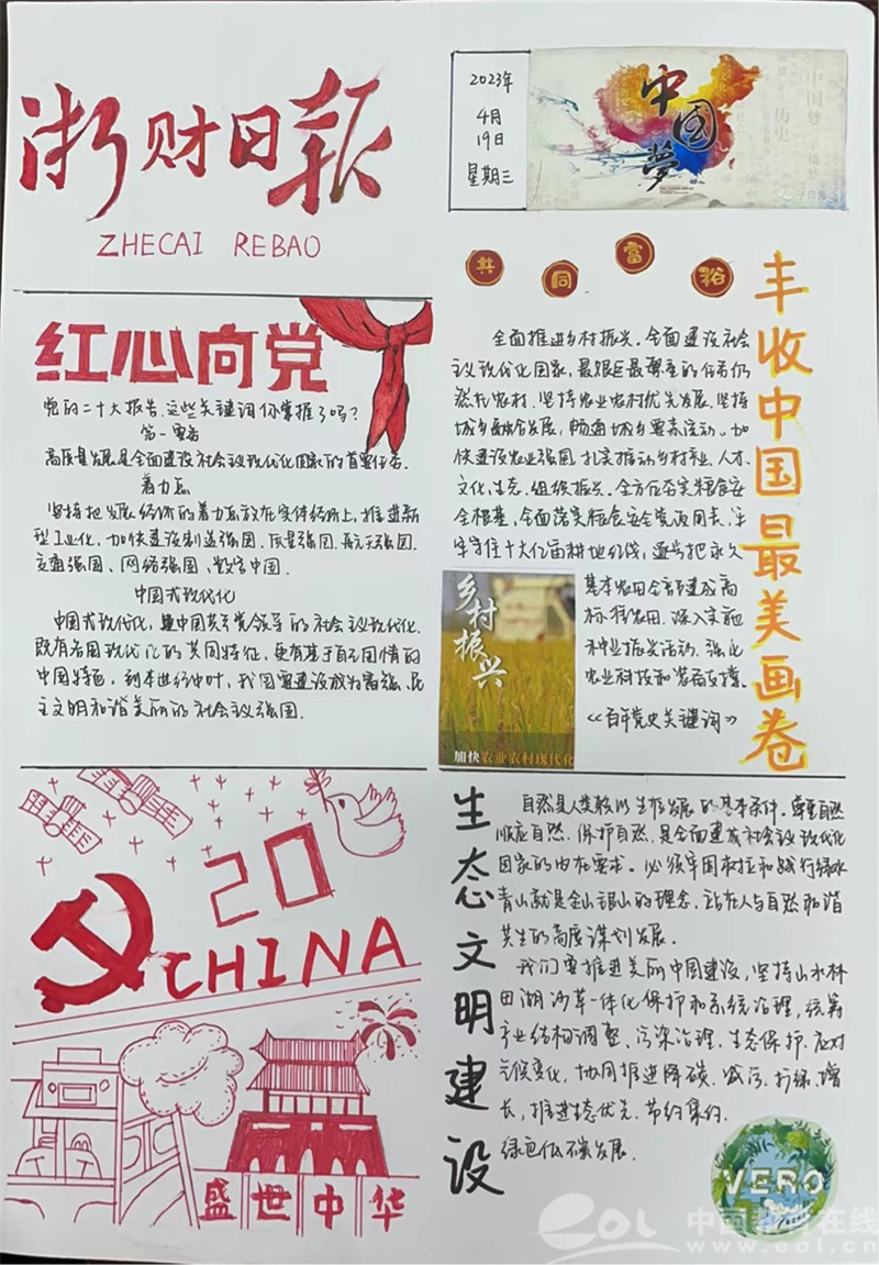 除了各具特色的书法作品外,红色报刊设计绘制活动给同学们提供了平台,绘制自己的独特的红色报刊。同学们用自己的想象和理解,绘出了中国独有的红色精神。一幅幅色彩明亮的报纸承载着新时代少年的风范与信念,也承载着祖国未来的希望。