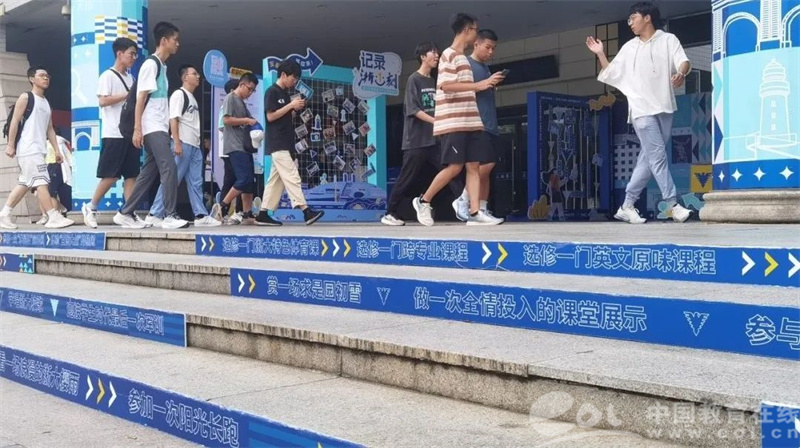 根据箭头指引走上台阶,就到了打卡处。许多新生与家长或新同学、新室友在印有“记录浙1刻”的背景板前打卡留念,拍完的照片还可现场打印。