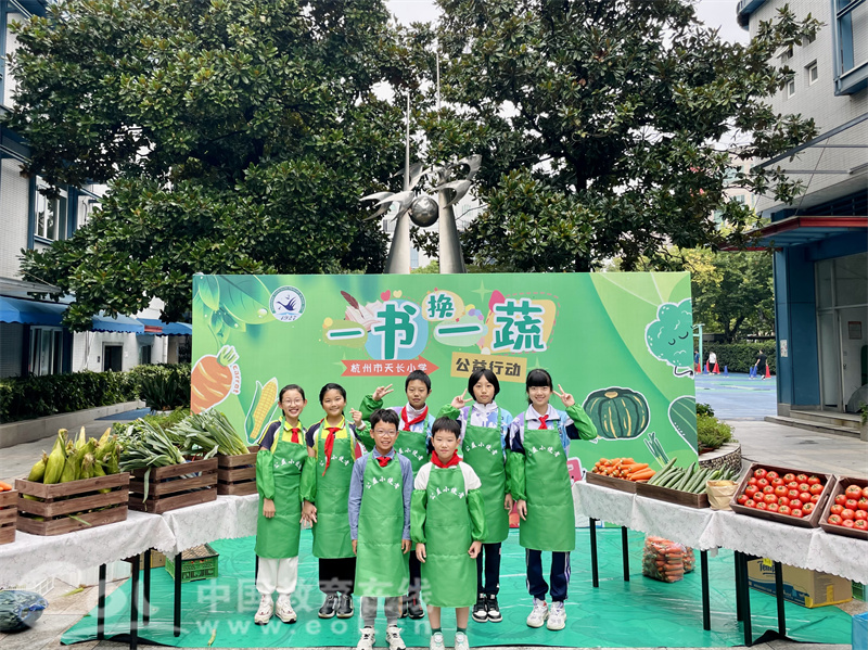 行走在天长校园,你会发现小朋友们手上都拿了一本课外书。原来,小朋友们将参加“一书换一蔬”活动。该活动由杭州市天长小学和贵州省黔西市林泉镇高锦小学联合举办,每一位小朋友能凭借一本家中闲置的课外书“漂流”换取来自贵州的有机蔬菜一份,而远在贵州的小朋友们将收到来自杭州小朋友们推荐的课外书。由此,知识得到延续,健康得到传递,两校的小朋友们在参与的过程中享受着绿色公益带来的快乐。