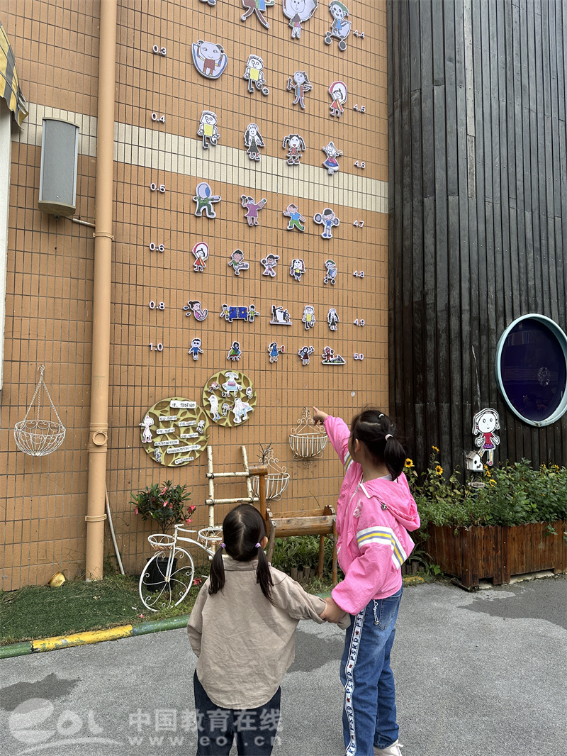 于是,幼托园牵手“医教结合”合作单位杭州市省人民医院,邀请眼科专家来园共同创设专属运动小人“视力表”。专家医生从幼儿视力保护的要素出发,结合幼儿园园所条件,因地制宜选择视力表摆放的规格、位置、结构,用科学合理的呈现形式,将孩子们的运动小人,变身成“视力表”上的符号,形成一张约三层楼高的“远眺表”。