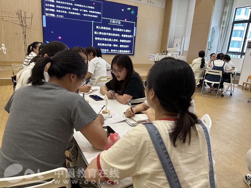 接着,老师们又玩起了“手指与表达”的游戏:一个手指代表不愿靠近,两个手指表示愿意与对方做点头之交的朋友,三个手指则表示愿意进一步了解对方并成为普通朋友,四个手指则表示愿意与对方建立深厚的友情。五个手指则由自己决定。小组讨论环节,老师们分享了两人间表达可能会出现的情况以及自己的感受。有老师认为,自己的决定无关紧要;而有的老师则认为,如果这种关系变成了同事关系,那将更能体现尊重。如果遇到这种关系变化时,需要更积极地调整自己,因为每个人的频率都是不一样的。