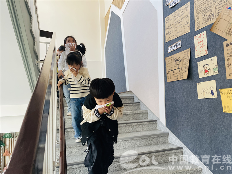 11月8日下午,幸福河幼儿园操场上突然浓烟滚滚、烟雾弥漫,此时发现险情的戴老师立刻拉响了消防疏散的警报声。紧接着,孩子们拿出小毛巾迅速浇湿并捂住口鼻,在老师的带领下弯腰有序地前行,穿过走廊,通过楼梯,迅速跑向操场。整个疏散演练过程紧凑有序,即使是托小班的小朋友,也能做到不尖叫、不起哄、不推挤,安静、有序完成了整个演练活动。